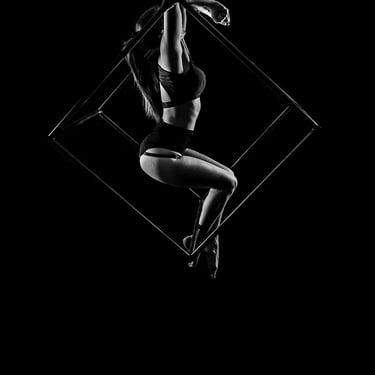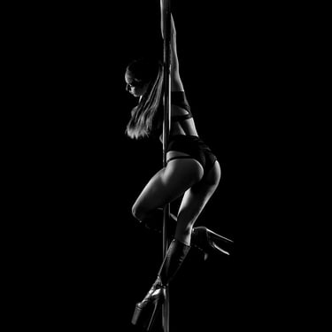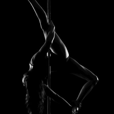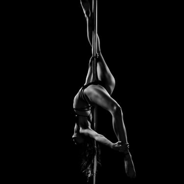 My pole dance and aerial dance photoshoots are primarily done in chiaroscuro, mostly in black and white. This style of lighting is at the heart of my work: it highlights the strength and grace of dancers, sculpting bodies and poses with intensity. This year, I’ve also been exploring a new variation of this lighting in magenta/cyan chiaroscuro, while staying true to the essence of my style.