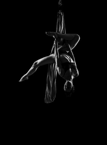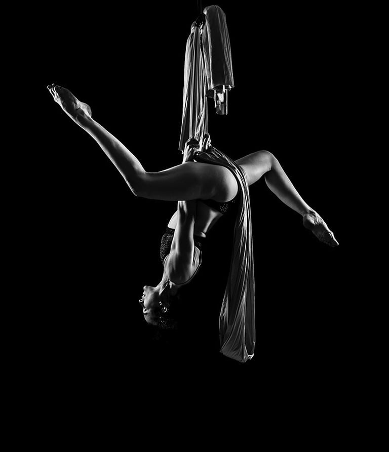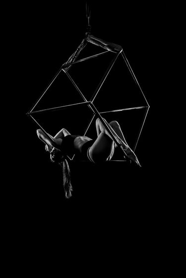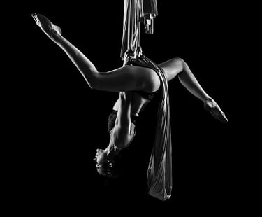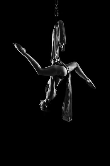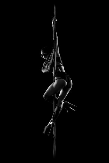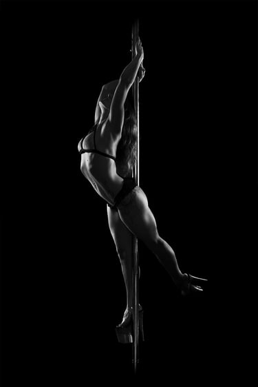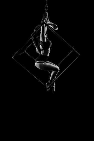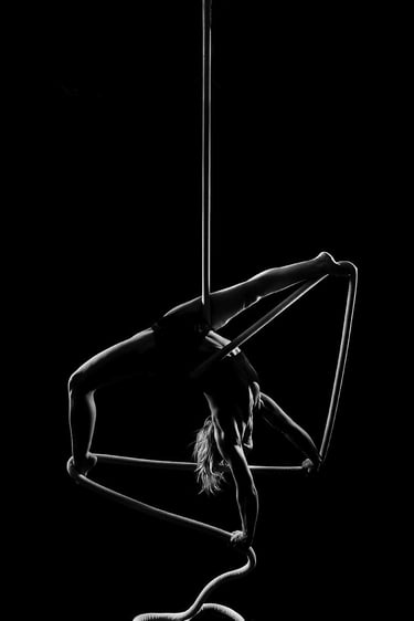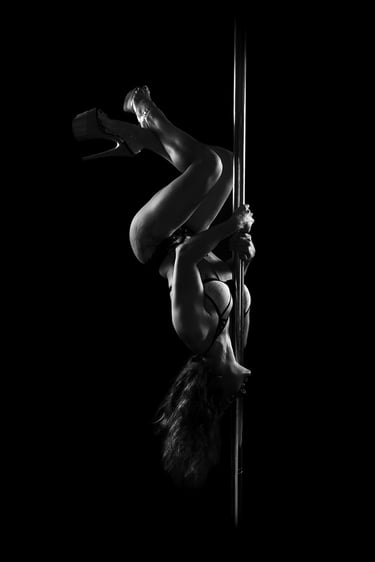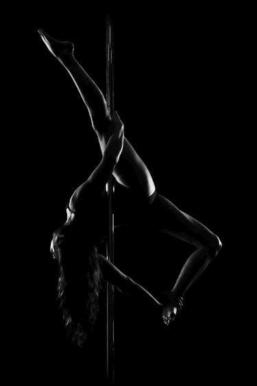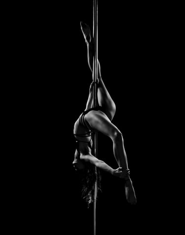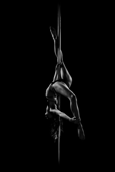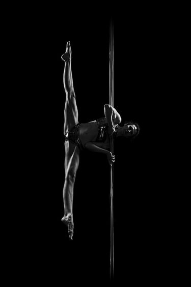 Mes photographies de pole dance, et plus généralement d'aérien, sont exclusivement réalisées en low key noir et blanc. J'ai toujours eu un attrait pour le noir et blanc et ce style d'éclairage. Il met en valeur la puissance et la grâce des danseurs et danseuses, en sculptant leurs formes et leurs figures avec intensité. Pas besoin d'avoir un niveau avancé pour un shooting de pole, cerceau ou hammock. Un simple "Sit", un "Pierrot" sont magnifiés par la lumière. On peut également jouer avec des poses au sol, du sexy, de la pole contemporaine, tout est adaptable à ton style et à ton aisance.